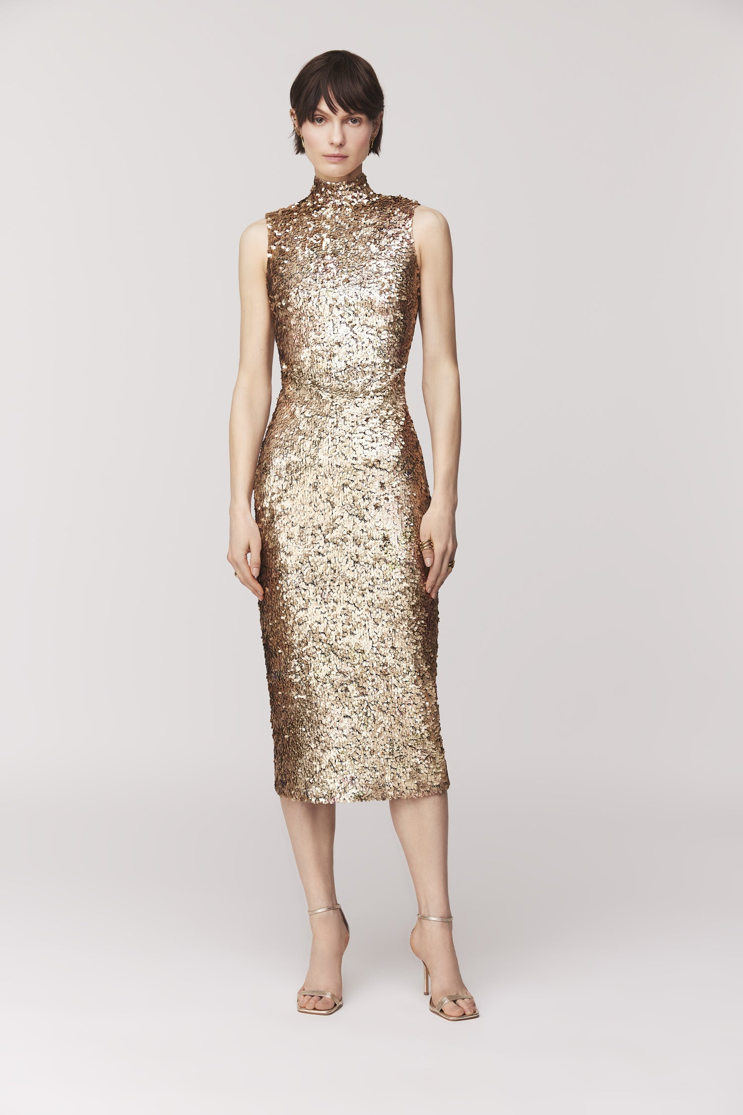 This stunning gold dress embodies the opulent metallic trend with its shimmering fabric and dramatic design.
