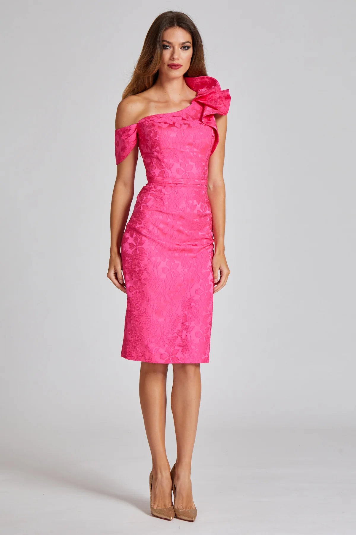 Look fabulous wearing this elegant pink ensemble! Boasting a knee-length jacquard pattern and a straight figure-flattering fit, this pink day dress puts an interesting twist on classic femininity with one ruched shoulder and one off-the shoulder sleeve.