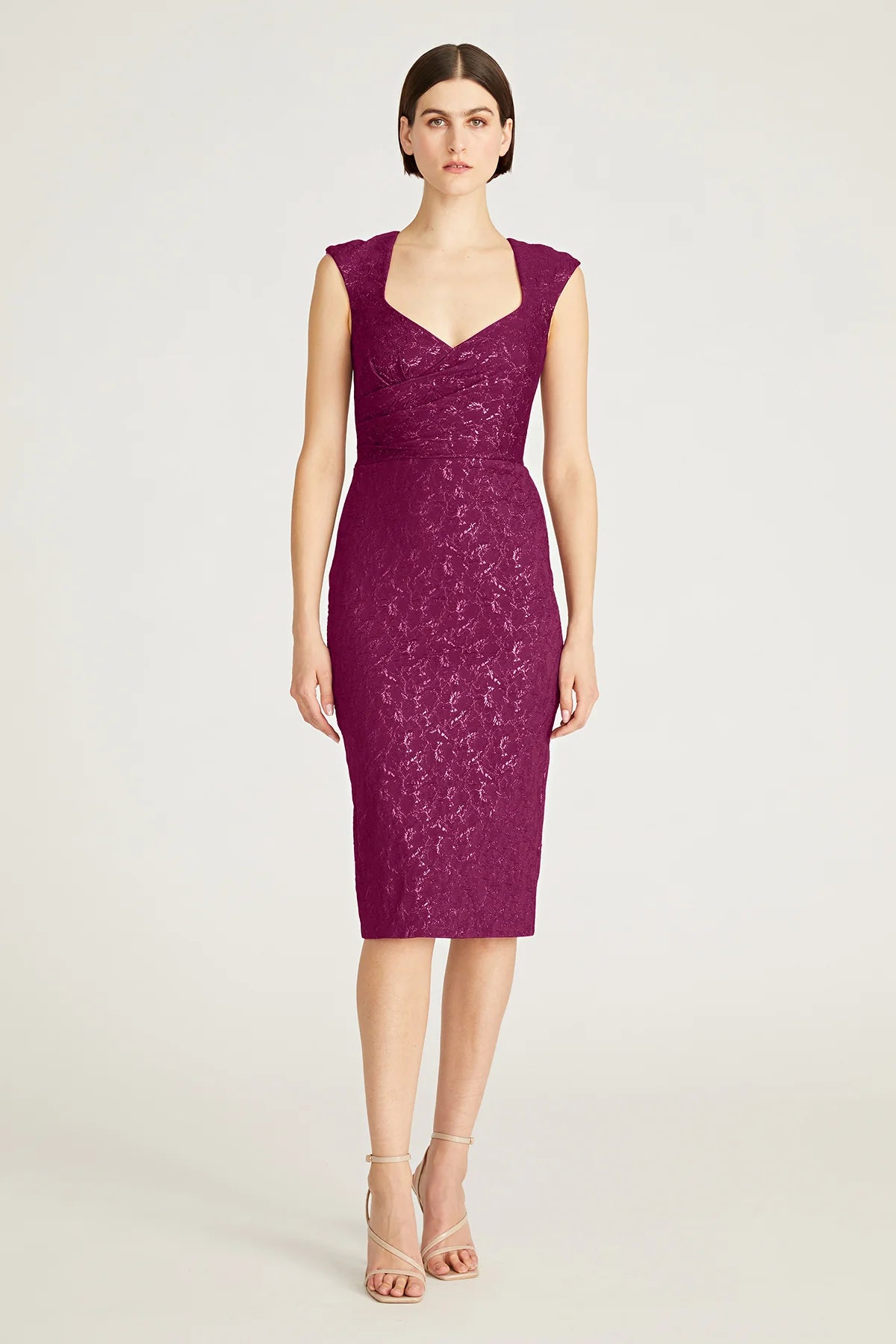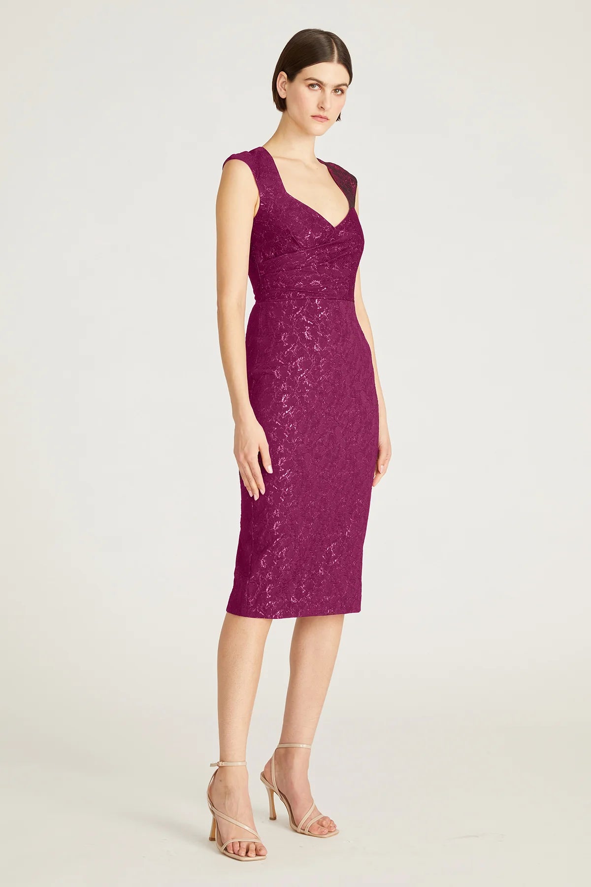 The dress is below-the-knee and has a fitted silhouette that gracefully accentuates your figure. The sweetheart neckline and wrap bodice with delicate cap sleeves add a touch of sophistication.